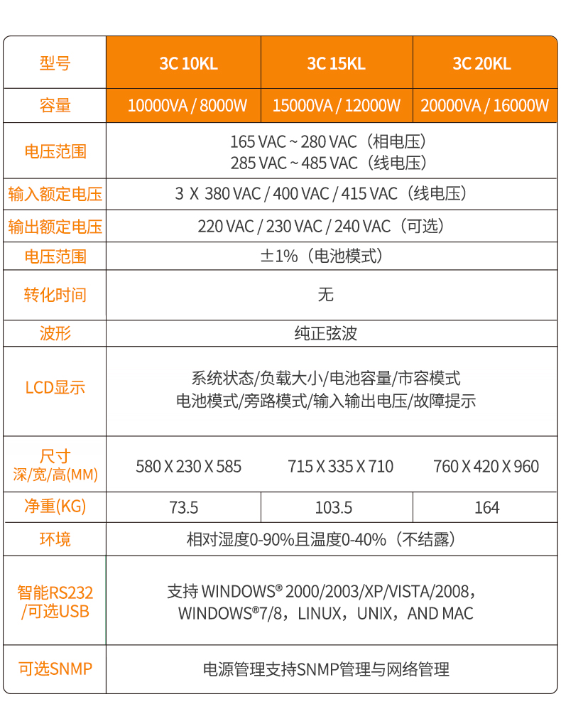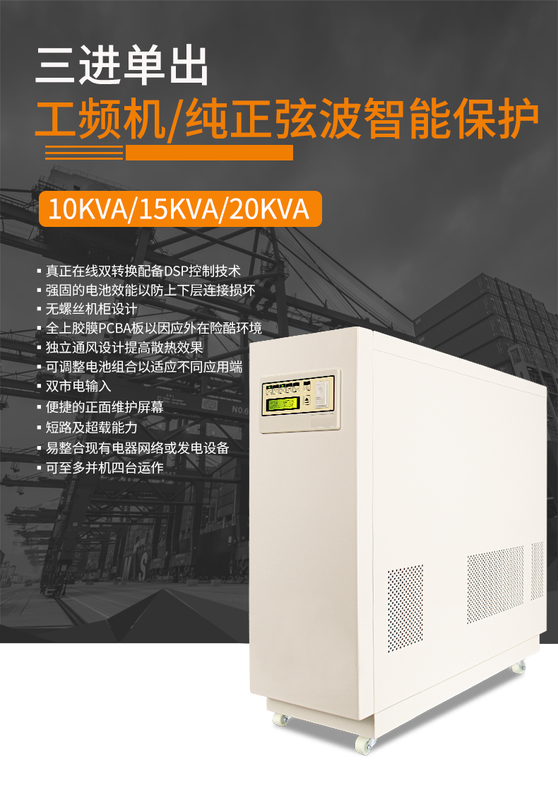 輸出功率:10KVA/8KW、15KVA/12KW、20KVA/16KW